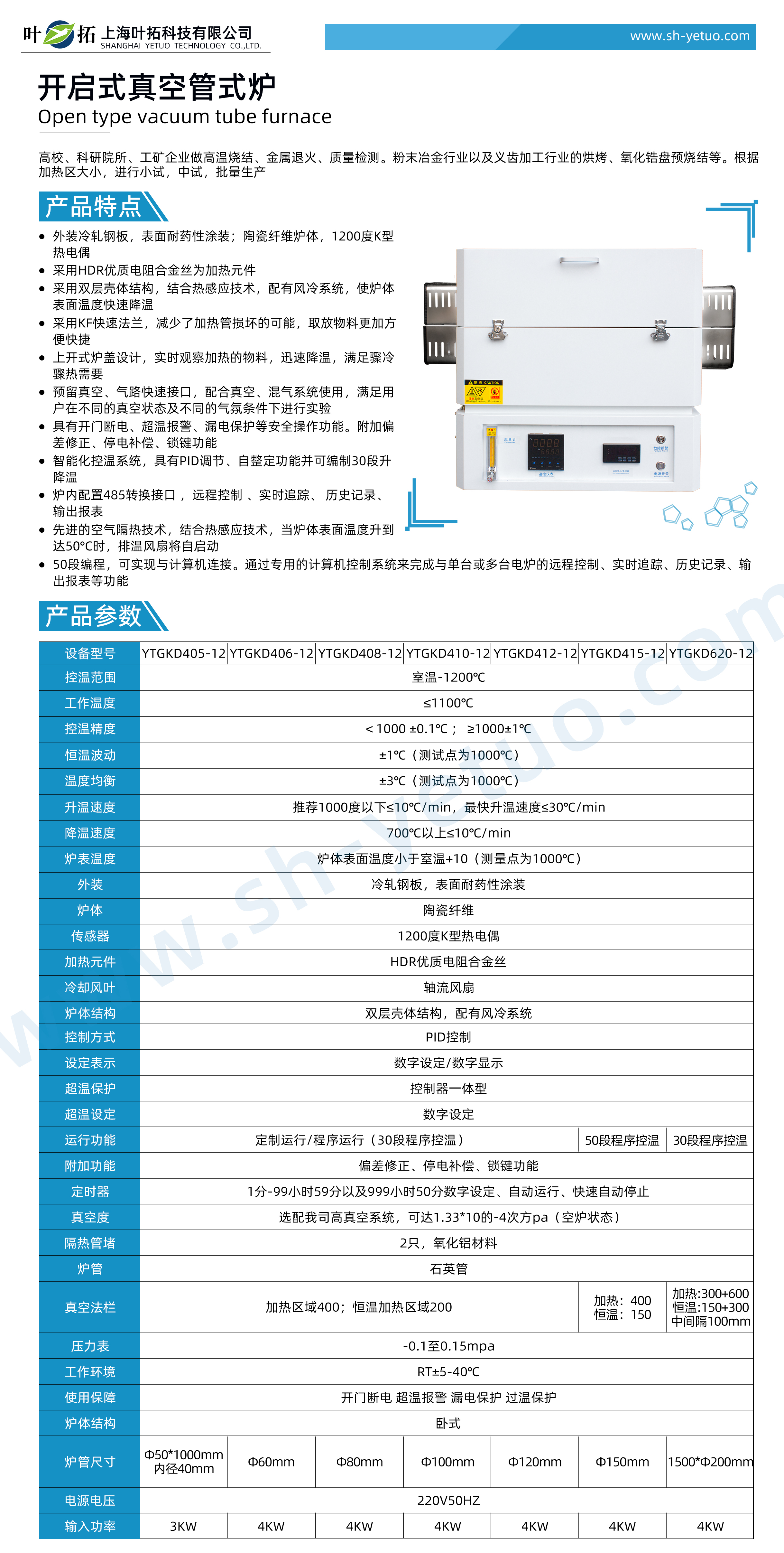 葉拓 YTGKD405-12 開啟式真空管式爐產(chǎn)品參數(shù)